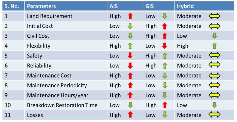 - GIS: Gas-insulated switchgear is compact and better for harsh environments.