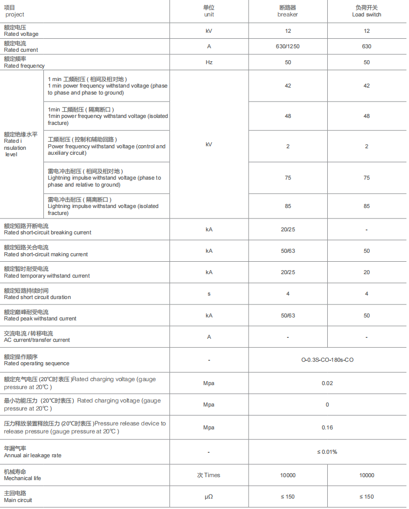 Standard configuration and features 630A busbar Vacuum load switch Manual operating mechanism of vacuum load switch Three-position disconnector Manual operating mechanism of three-position disconnector Position indicator of three-position disconnector of load switch Cable wiring bushing Capacitive voltage indicator showing bushing voltage Voltage gauge Padlocking device Grounding busbar of switchgear Operating handleOptional configuration and features: Electric operating mechanism of vacuum load Separable connector (cable connector) Lightning arrester Live/grounding locking device for incoming line Key mechanism and locking device Toroidal current transformer |